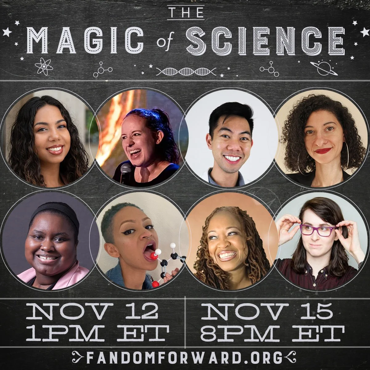 A graphic that features the headshots of the eight Magic of Science guests, as well as the text “The Magic of Science, Nov 12 1pm ET, Nov 15 8pm ET, fandomforward.org.”